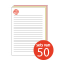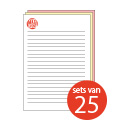 Met het aantal vellen kan je kiezen om de doordruksets te bundelen, of om ze toch per set apart te houden. Kies je voor sets van 1, dan is ook nog elke set op zich samen gelijmd. Bij 2 vellen krijg je op die manier dus setjes die per 2 samen hangen. Ook welke kleur van papier in welke volgorde je ze wilt, kan je onderaan opgeven bij de opties. We kunnen ze bovendien ook reeds voorzien van 2 of 4 boorgaten. |